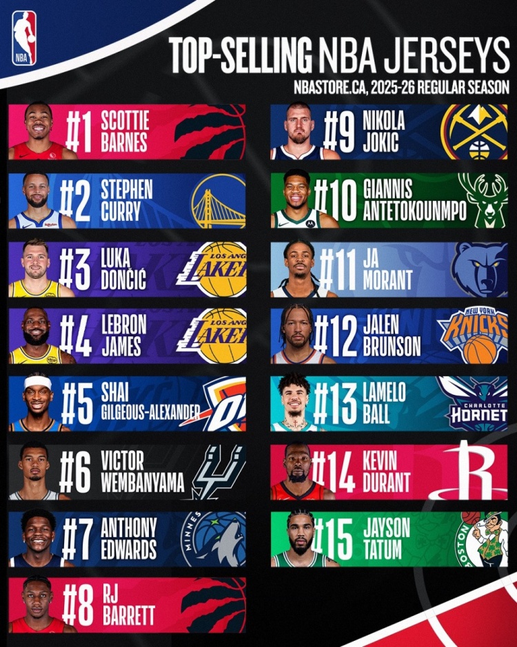 1月24日讯 NBA Canada发布了基于加拿大NBAStore的球员球衣上半赛季销售数据。猛龙球员斯科蒂·巴恩斯排名第一,库里排名第二,东契奇排名第三。